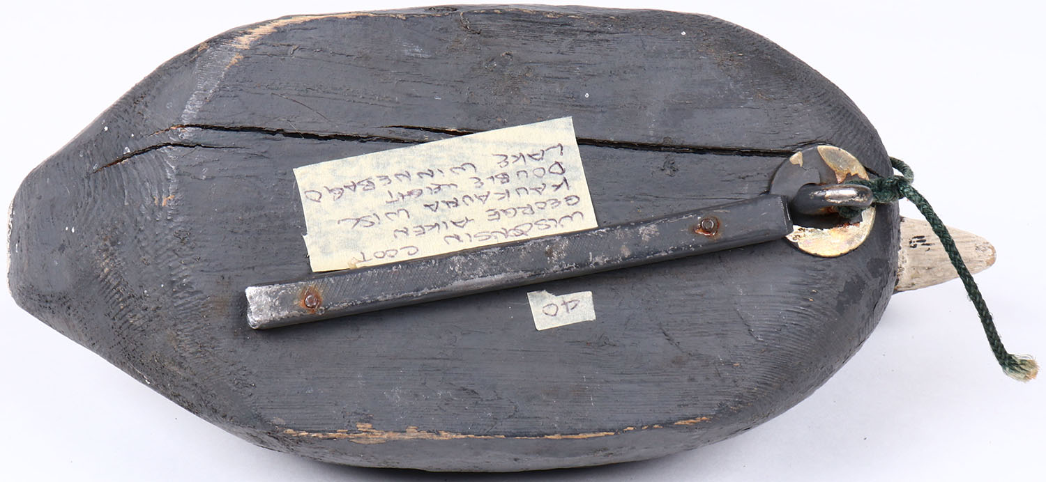 Coot by George Alken, Kaukauna Wisc. Lake Winnebago, has double weight on the bottom front, glass eyes, solid wood, original paint, structurally excellent. Grade: Excellent + - Value: 20 to 40