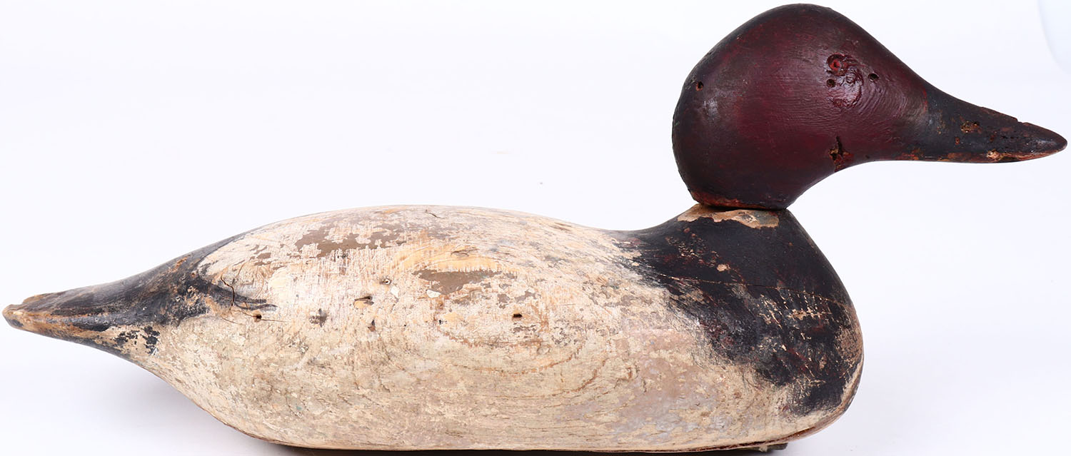 Canvasback Drake by unknown factory, glass eyes, one eye is missing, original paint, has age cracks on back and on bottom. Grade: Very Good ++ - Value: 30 to 60