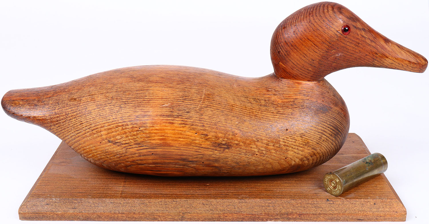 Mallard Hen by Mason Decoy Company (1980s repop), sometimes paired with a Mason Decoy Company commemorative Wooden Box, glass eyes, solid wood on wood base with empty brass shotshell on it, structurally excellent. Grade: MINT - Value: 10 to 30