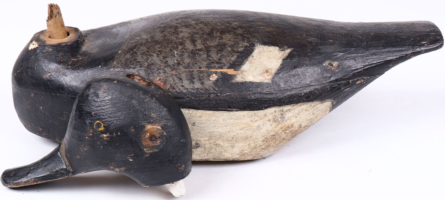 Bluebill Drake by unknown maker, NJ?, painted eyes, hollow wood, head is broken off from body, original paint. Grade: Very Good + - Value: 50 to 100
