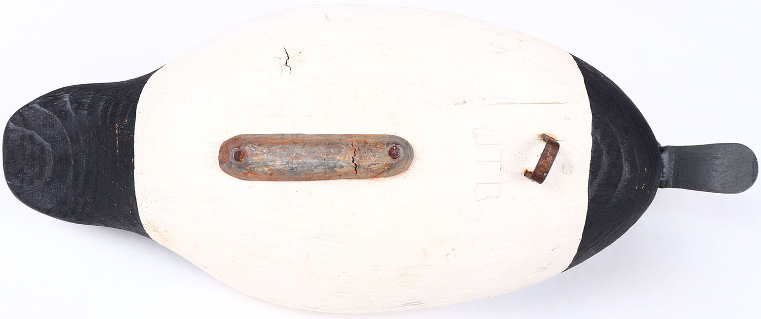 Bluebill Drake by JTB, painted eyes, solid wood, original paint, structurally excellent, branded JTB on bottom. Grade: MINT - Value: 30 to 60