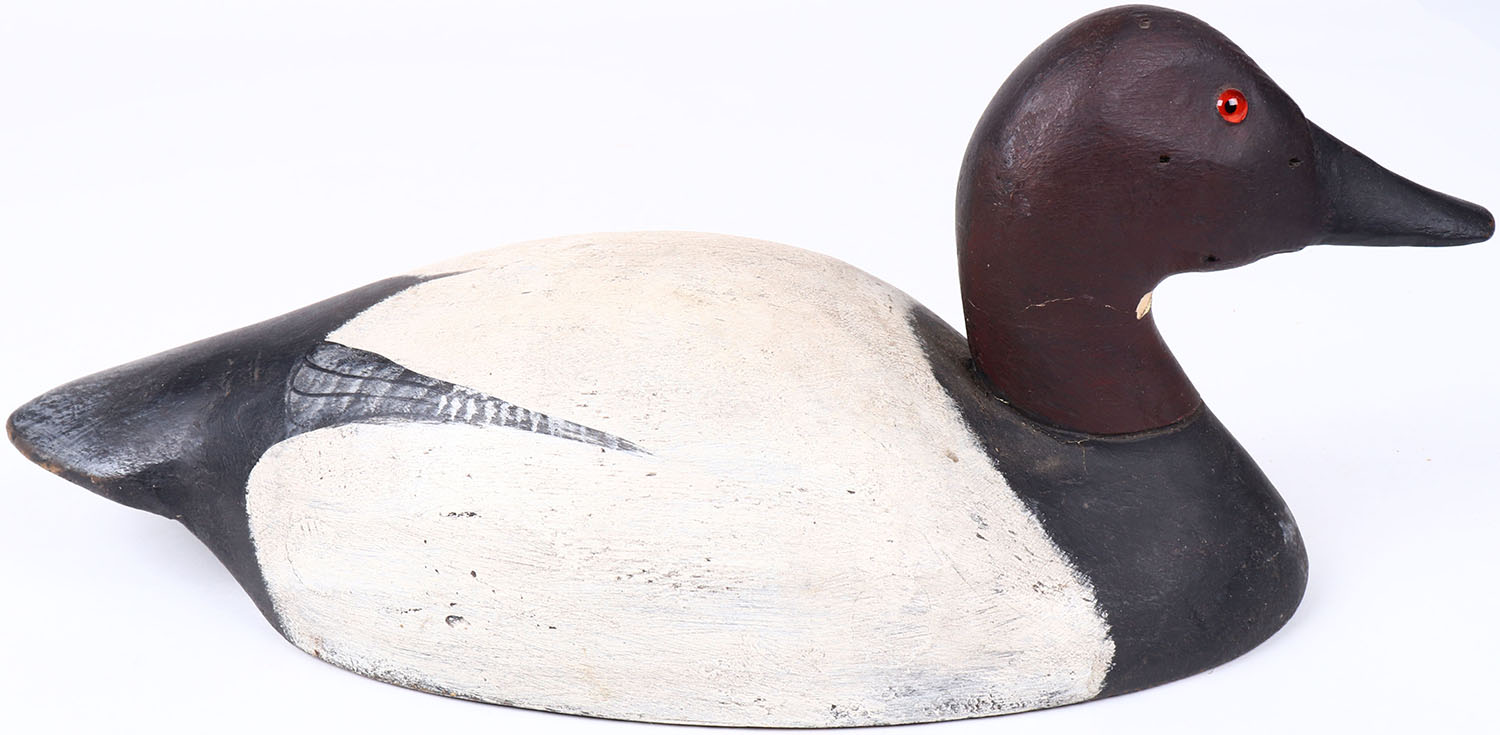 Canvasback Drake by unknown maker, glass eyes, solid wood, original paint, structurally excellent. Grade: Excellent - Value: 40 to 80