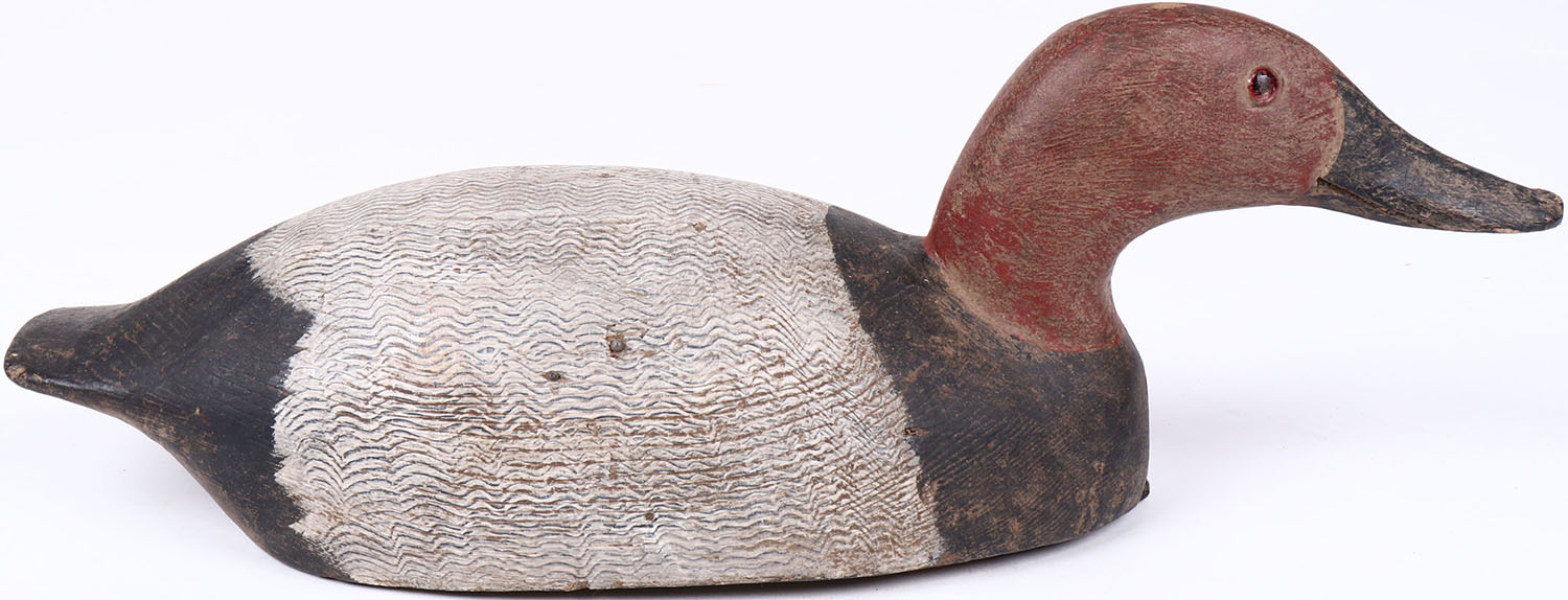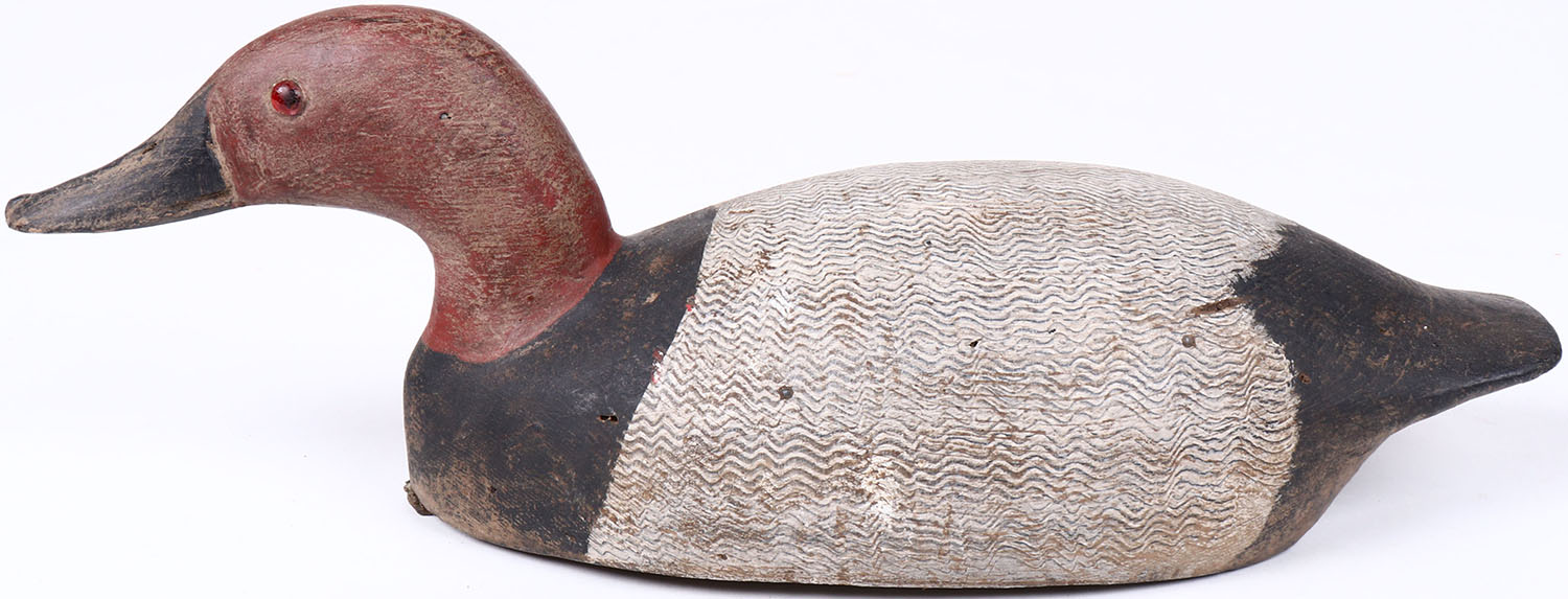 Canvasback Drake by unknown maker, glass eyes, solid wood, original paint with comb painting, structurally excellent. Grade: Excellent + - Value: 40 to 80