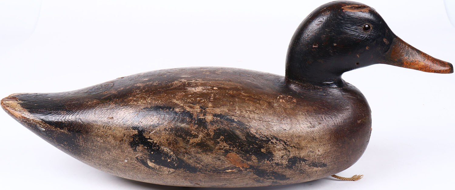 Mallard Drake by ? Ora Clough, WI, glass eyes, hollow wood, original paint with typical wear, structurally excellent, signed on bottom. Grade: Excellent - Value: 100 to 200