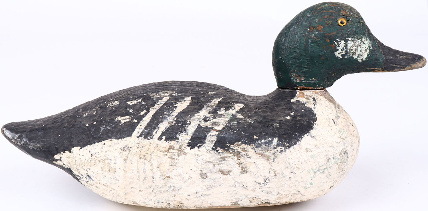 Goldeneye Drake appears to be Gundelfinger Factory, glass eyes, solid wood, original paint, has age crack on back.