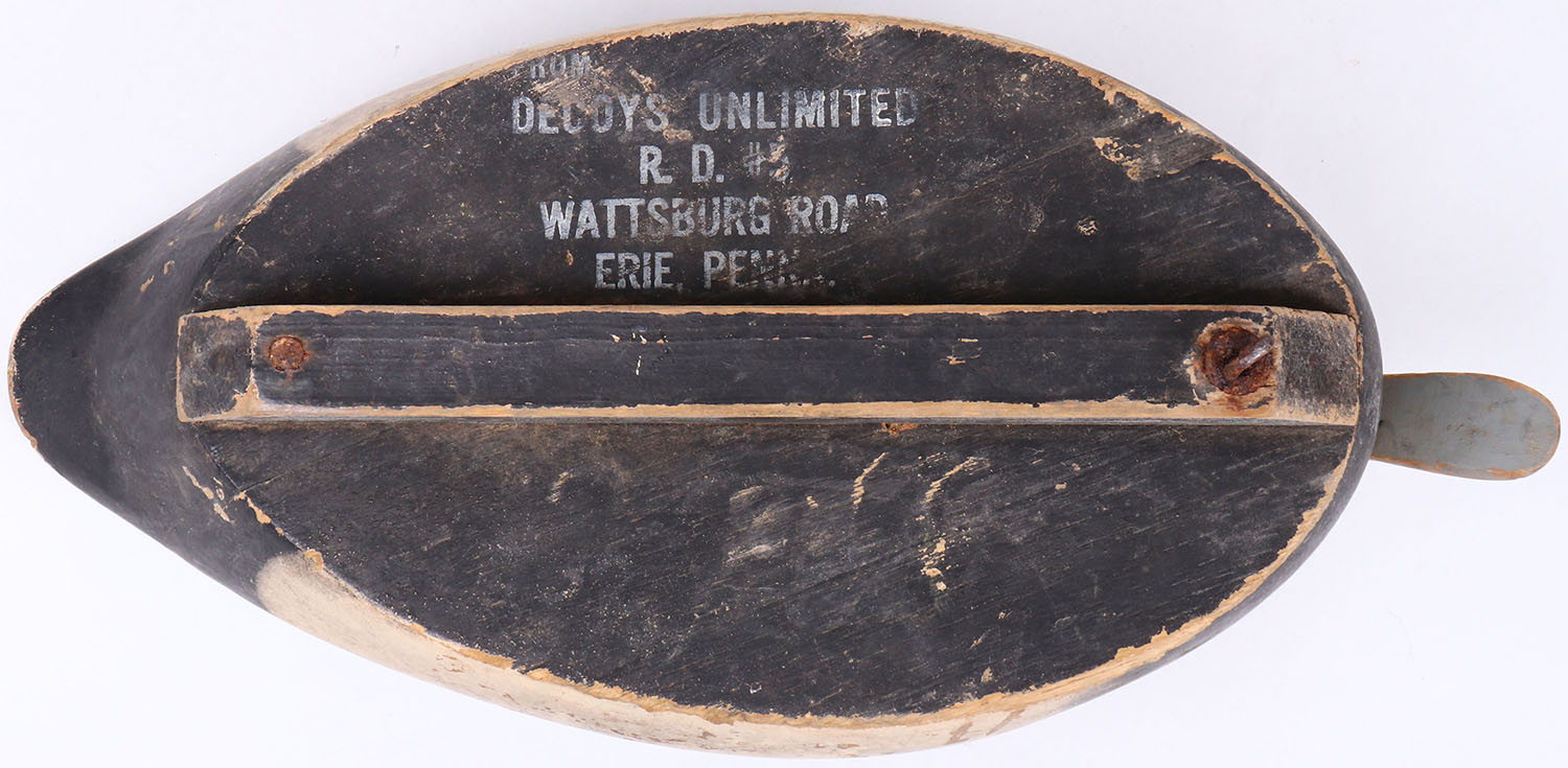 Bluebill Drake by Decoys Unlimited R.D.H. Wattsburg Road, Erie, PA, glass eyes, hollow wood, original paint with comb painting, head is missing some paint. Grade: Excellent - Value: 20 to 40