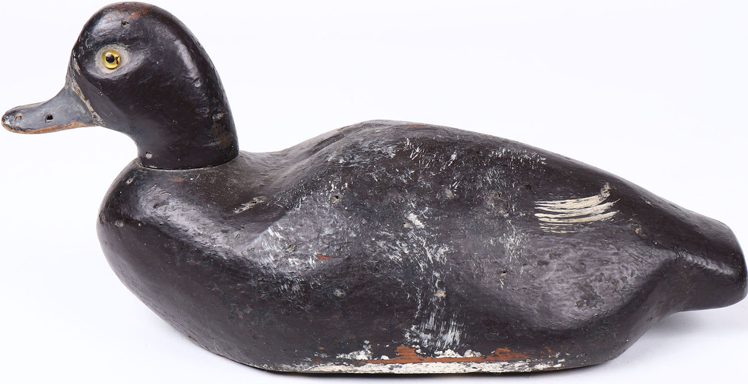 Bluebill Drake by unknown maker, glass eyes, solid wood, original paint, has hairline age crack on bottom. Grade: Excellent - Value: 40 to 80