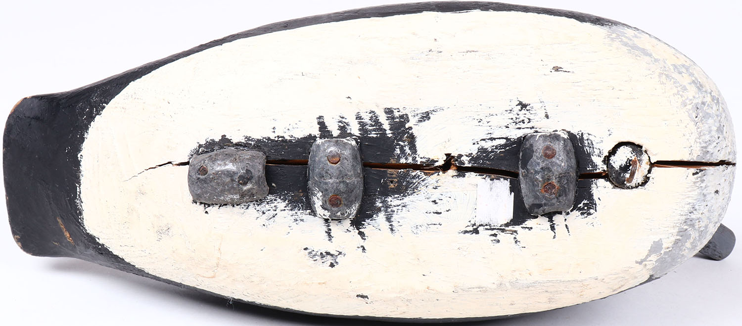 Bluebill Drake by unknown maker, eyes are missing, solid wood, original paint, has age cracks on bottom, head is loose. Grade: Very Good + - Value: 30 to 60