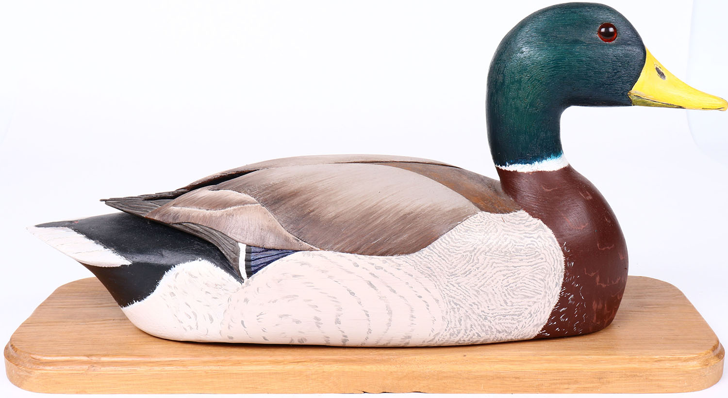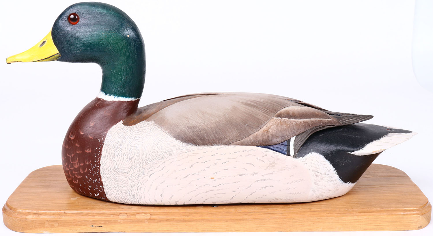Mallard Drake on wood stand by T.O Stecher, glass eyes, solid wood, original paint, structurally excellent, signed on bottom. Grade: MINT - Value: 50 to 150