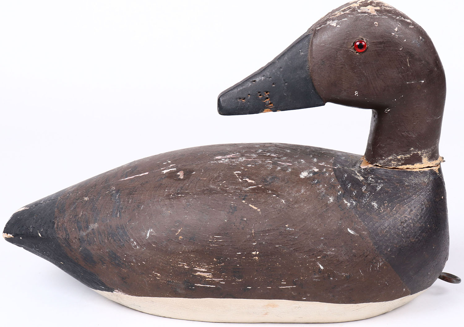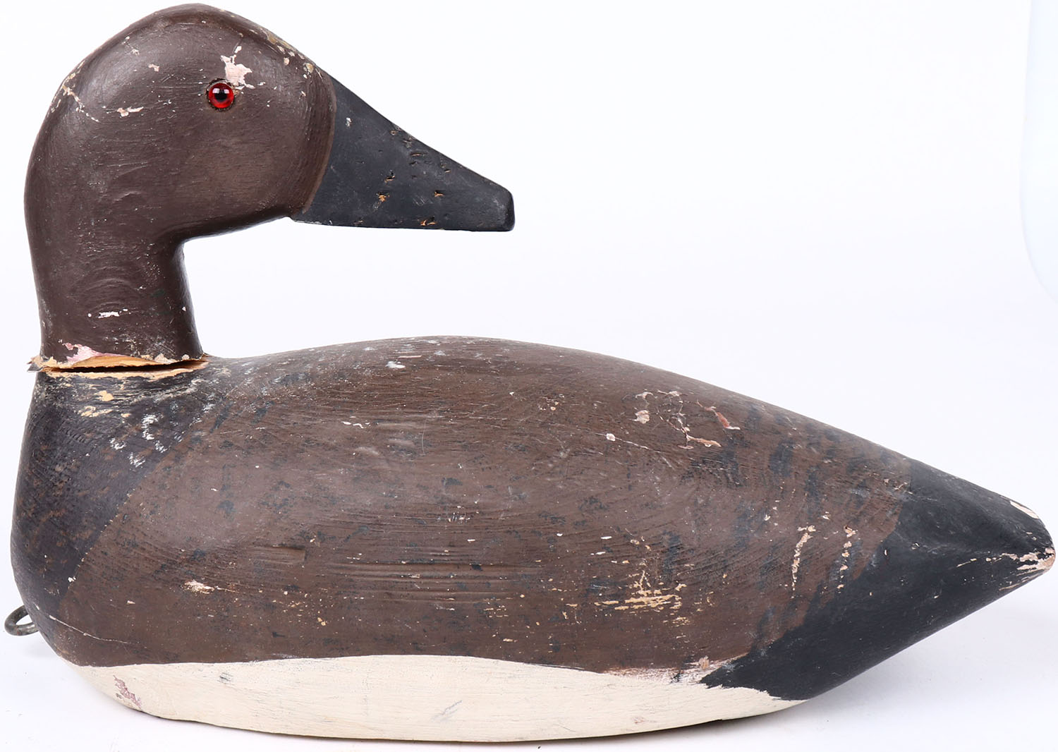 Preening Canvasback Hen by unknown maker, glass eyes, solid wood, original paint, head is slightly loose. Grade: Very Good ++ - Value: 30 to 60
