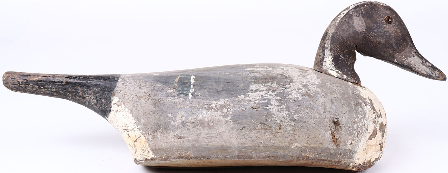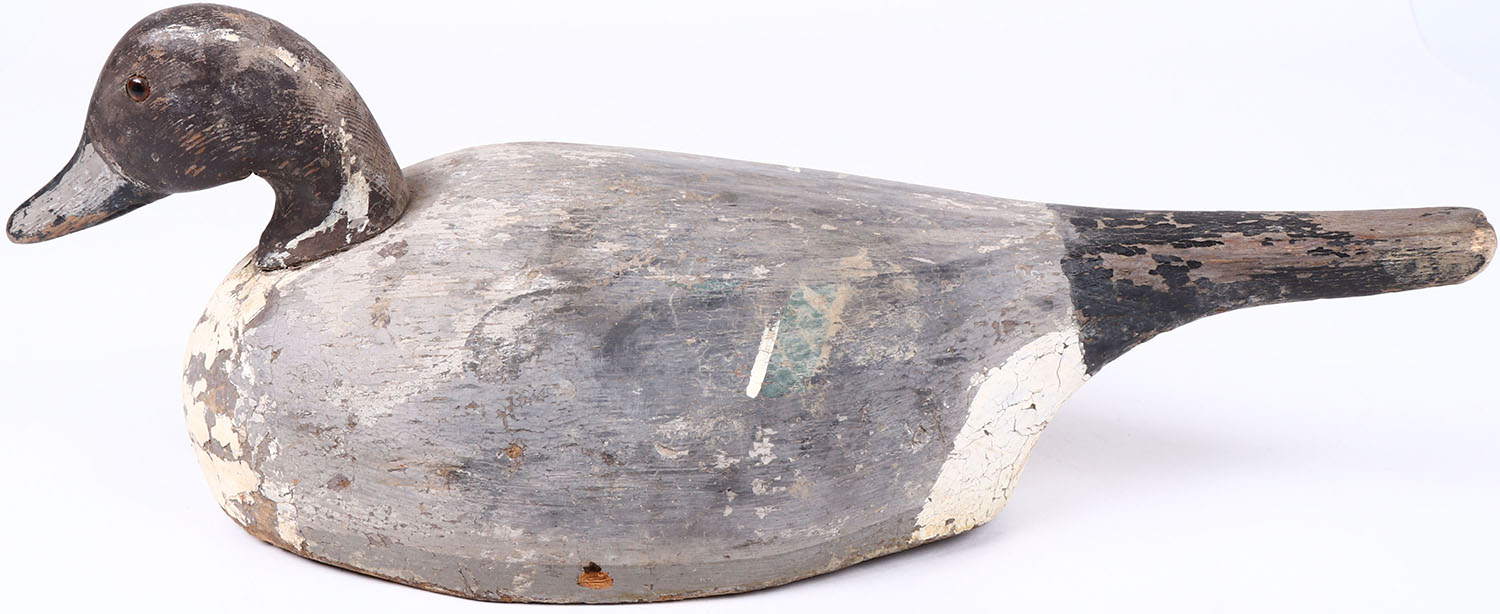 Pintail Drake by unknown maker, glass eyes, hollow wood, original paint, paint is coming off on whole body. Grade: Very Good ++ - Value: 30 to 60