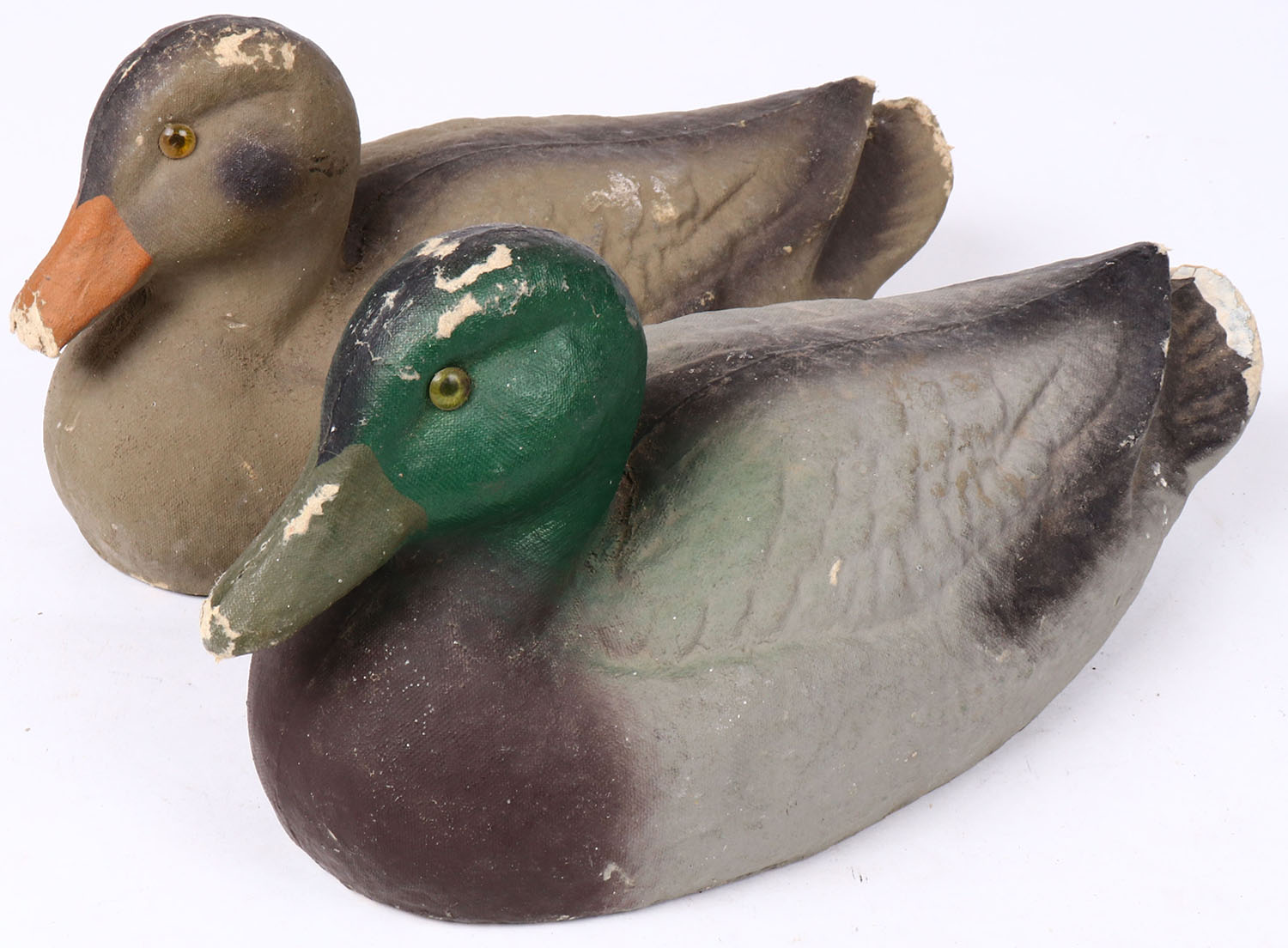 Pair of Mallards by Carry Lite Decoys, glass eyes, original paint. Wear at bill area. Grade: Very Good - Value: 10 to 40