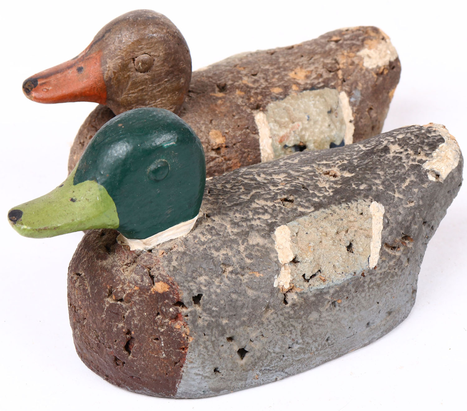 Pair of miniature Mallards by unknown maker, painted eyes, cork body, orignal paint, structurally excellent. Grade: Excellent + - Value: 30 to 60