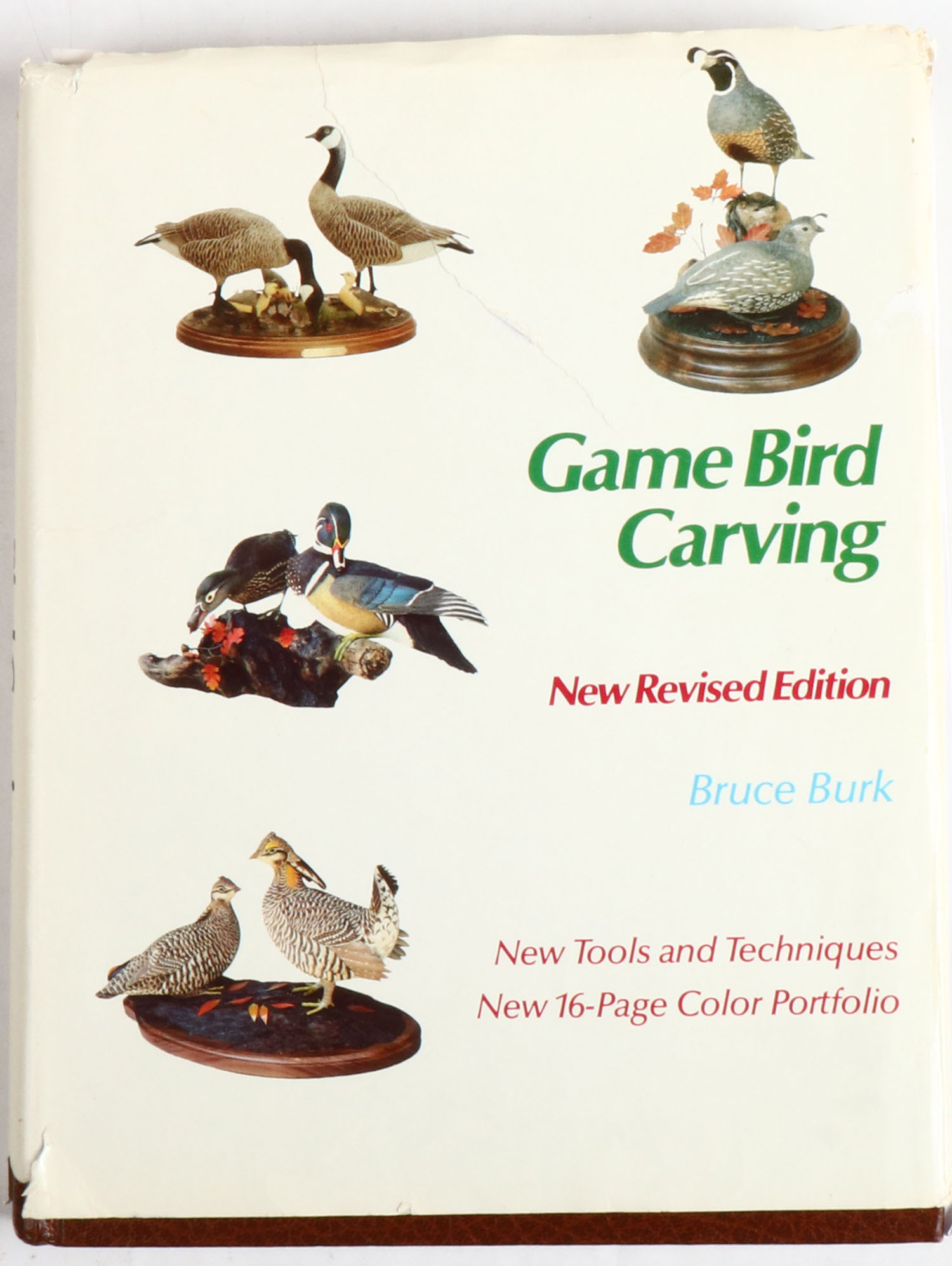 Game Bird Carving by Bruce Burk new revised edition 1972, 8 1/2'' x 11''. 291 pages, pages clean, binding tight, hardcover excellent, dustjacket has some tearing, b/w and colored images. Value: $40 Grade: Excellent - Value: 2 to 40