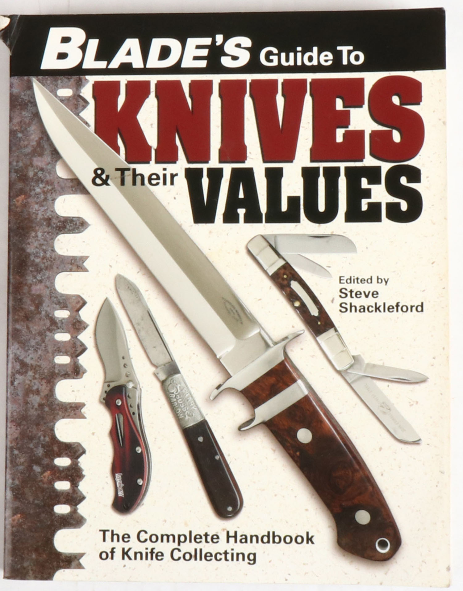 Blade's Guide To Knives & Their Values by Steve Shackleford, 8 1/2'' x 11''. 576 pages, pages clean, binding tight, softcover very good with some tears, b/w images. Value: $120 Grade: Very Good ++ - Value: 10 to 100
