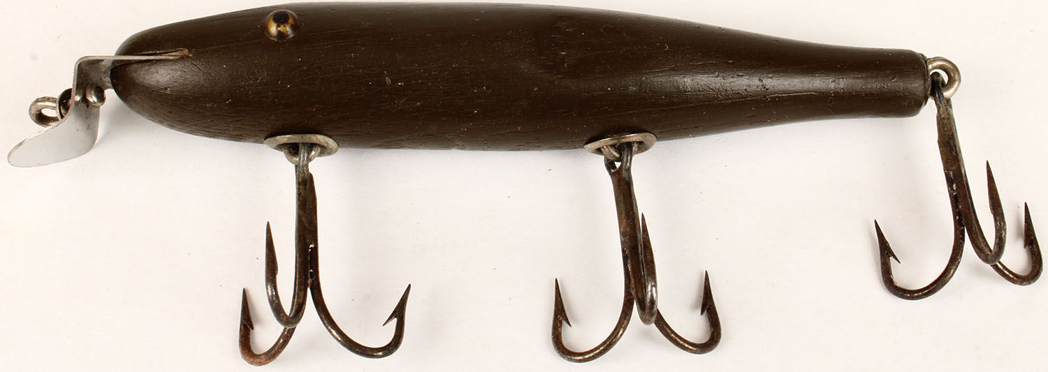 Creek Chub Pikie, repainted to olive green, TE, 3 hook. Grade: Very Good - Value: 2 to 20