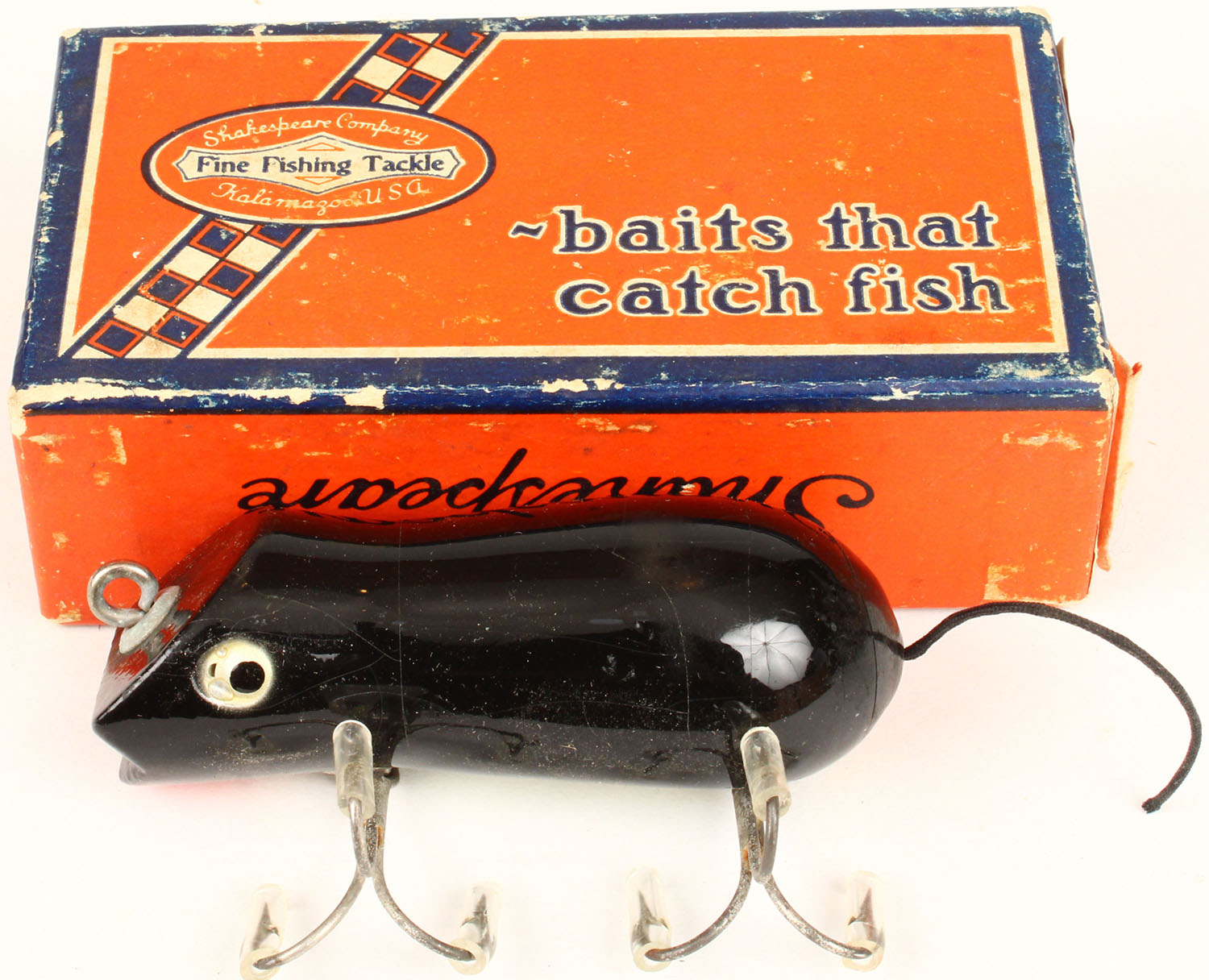 Shakespeare Swimming Mouse in original box with paperwork, No. 6580 B, Black wood lure with CE & tail. Grade: MINT - Value: 10 to 50