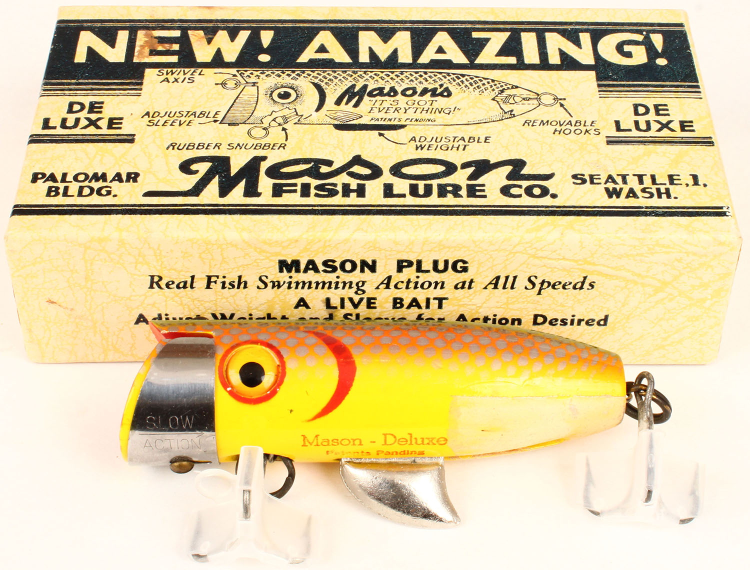 RARE Mason DELUXE Fish Lure, Yellow Herring with red gills, CE, red, green, yellow & silver scale, original box with paperwork, what make this lure rare is it has an adjustable belly weight for trolling faster or slower, also has rubber inner core to absorb the shock of the fish hitting the lure plus a metal lip that is adjustable for diving deeper, both lure & box are near mint. Grade: Excellent ++ - Value: 50 to 500