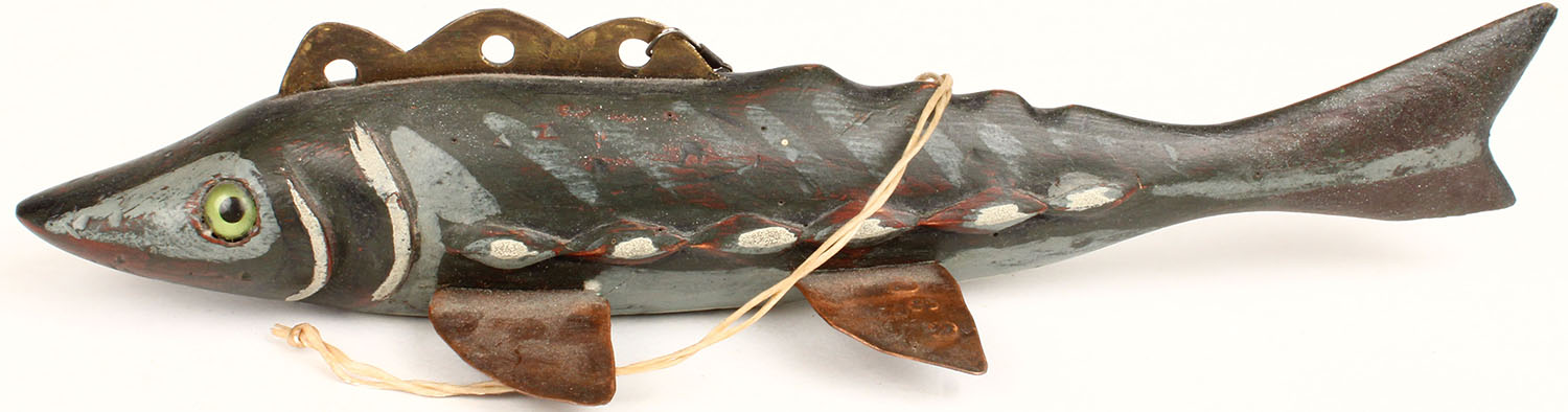 J.J. Hildreth Ice Fishing Decoy, GE, Sturgeon, small chip to bottom of tail, 3 line ties, has 5 metal fins, 9'' OAL. Grade: Very Good + - Value: 10 to 150