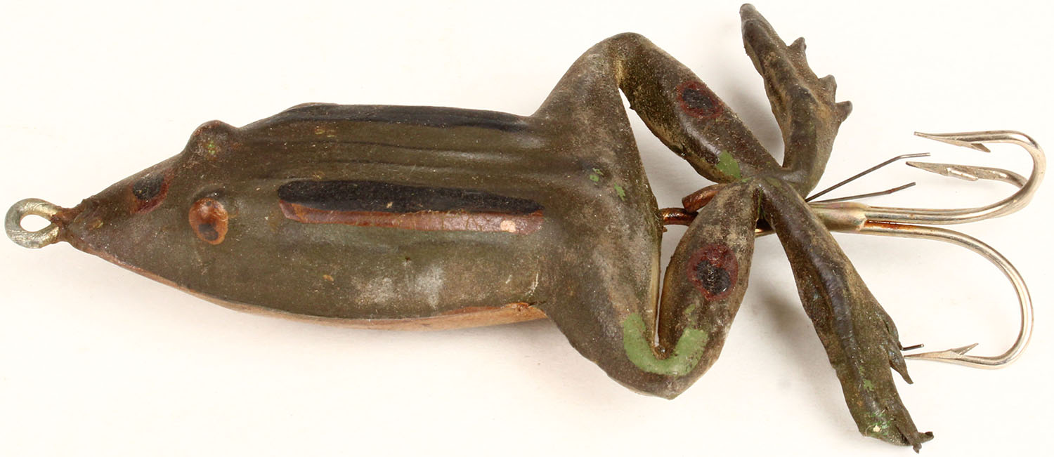 | Unmarked Rubber Frog, single weedless treble hook. Grade: Excel...