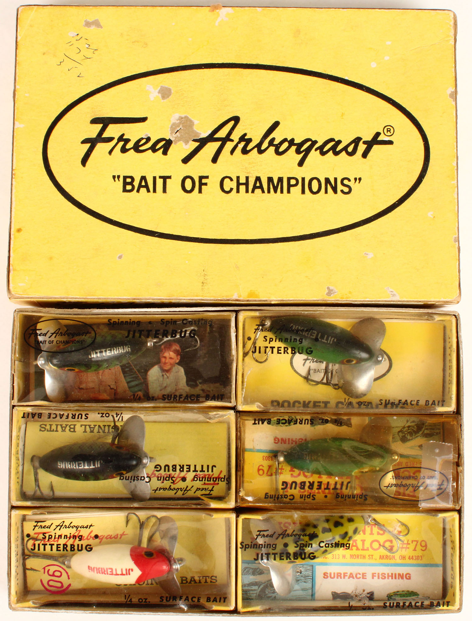 Full Case of assorted Fred Arbogast Jitterbugs in original boxes. Grade: Very Good ++ - Value: 30 to 150