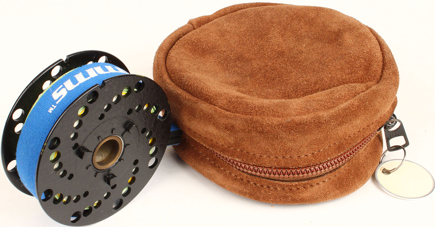 Feurer Bros. Fly Reel Spool, looks new, 3 1/8'' dia., has leather pouch. Grade: Excellent - Value: 20 to 60