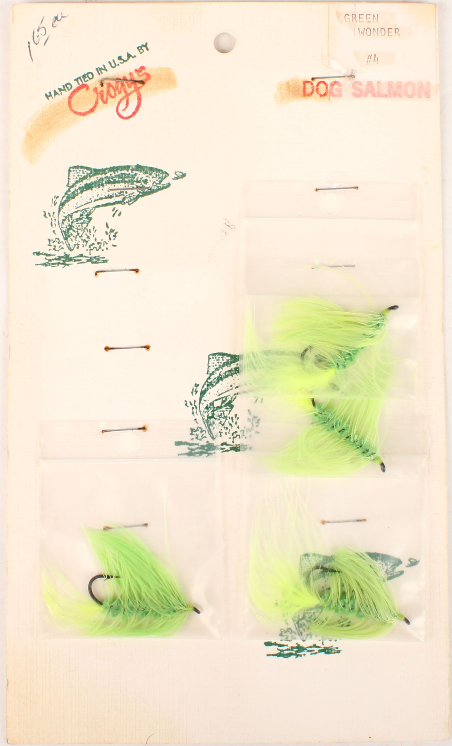 Crogy's Dog Salmon flies on card, 5'' x 8 1/2''. Grade: MINT - Value: 2 to 20