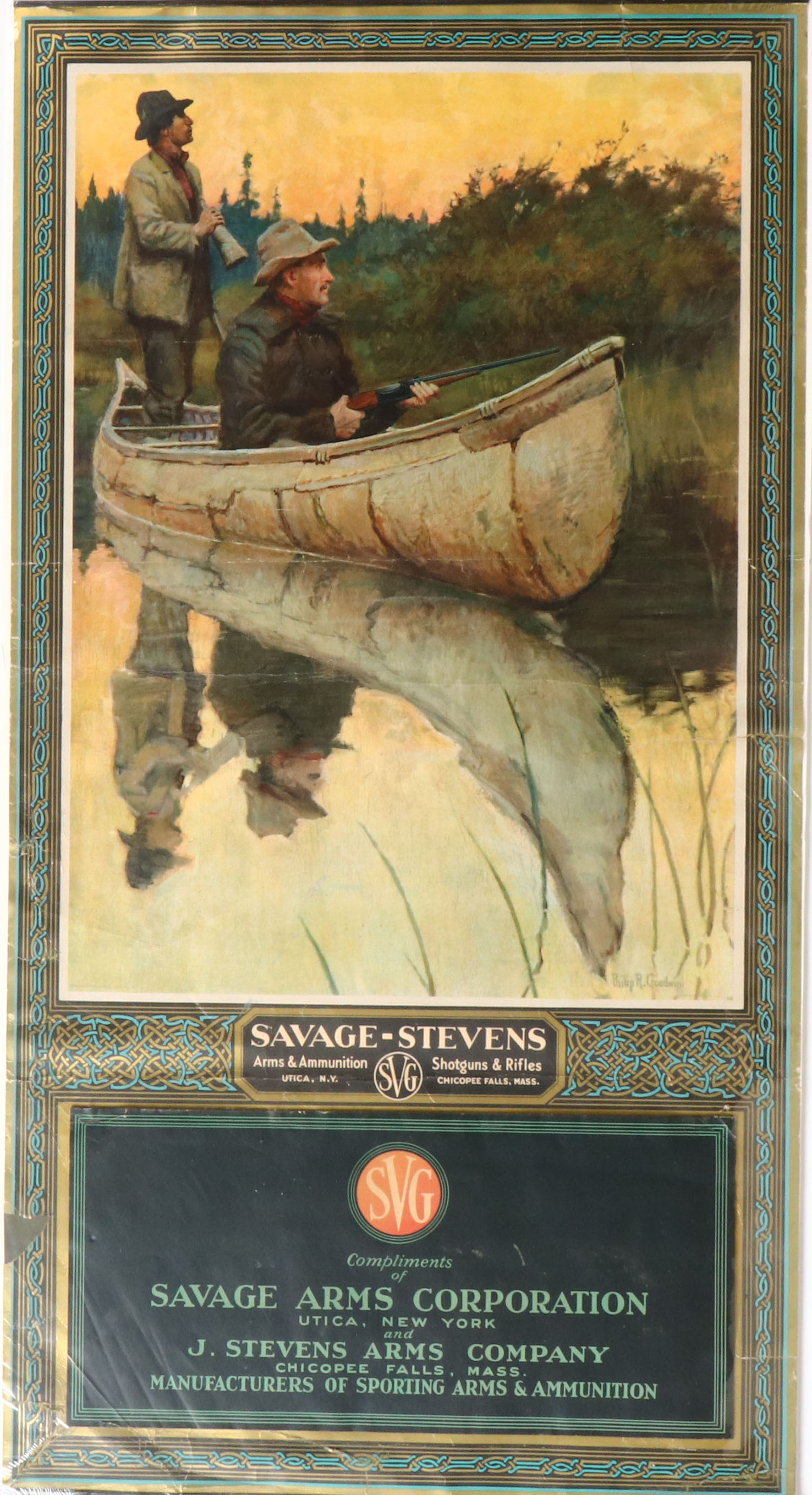 Rare 1929 Savage Stevens calendar by Philip R. Goodwin, wonderful images of two moose hunters in birch canoe, has metal bands top & bottom with two brass hanger, shows a few tears to edges with a few roll wrinkles, full pad of pages, hard to find calendar. Grade: Very Good ++ - Value: 700 to 2000
