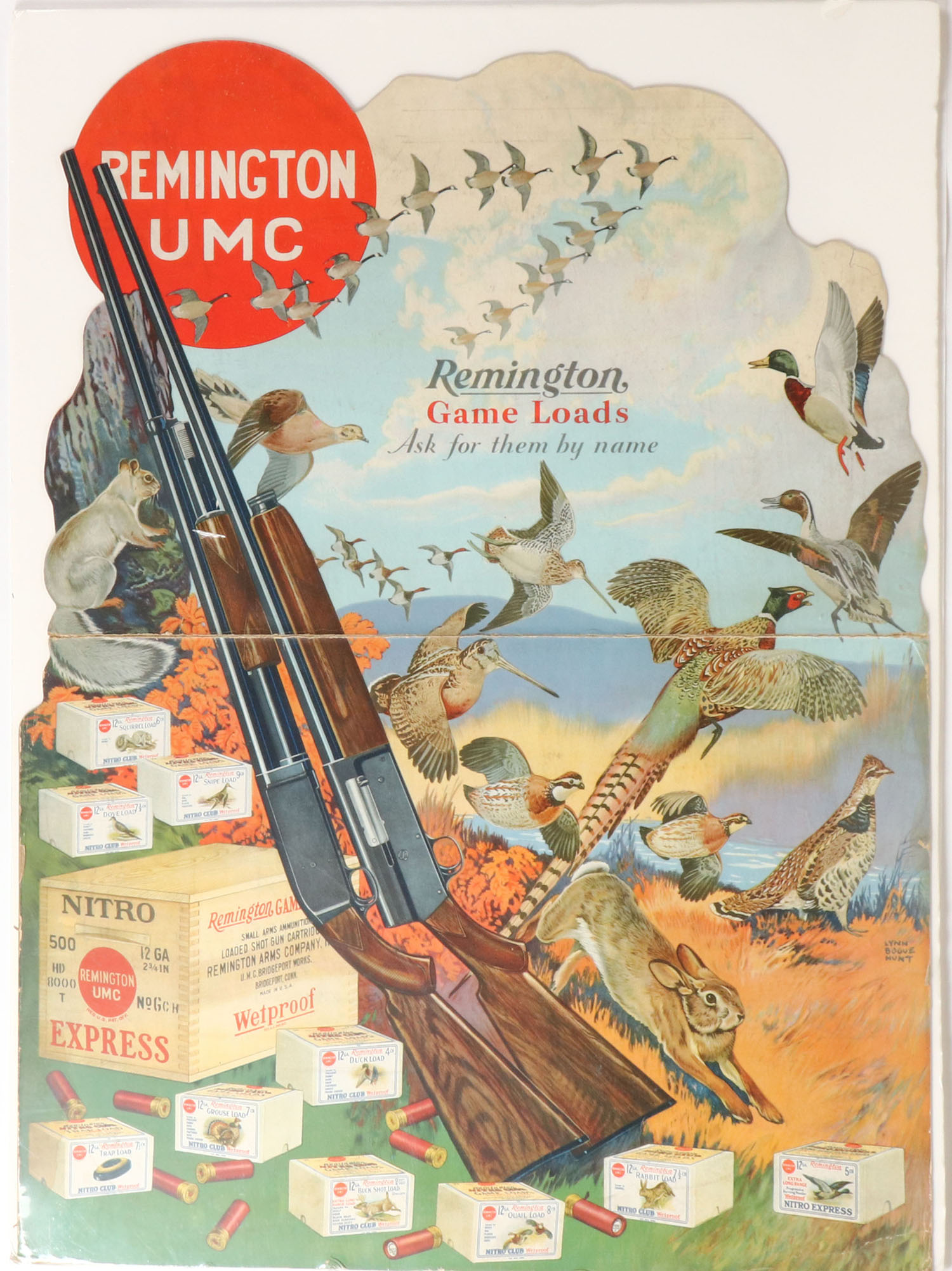 Remington GAME LOADS Diecut by Lynn Bogue Hunt, pictures many game birds & animals with two shotguns plus many 2pc game load shotshell boxes, 28 5/8'' x 39'', shows light edge wear & a fold mark otherwise great colors, hard to find. Grade: Excellent - Value: 1000 to 3000