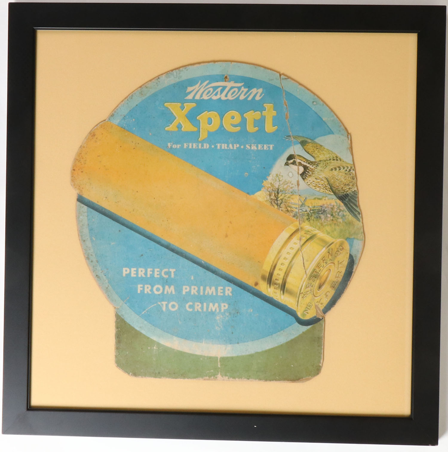 Western XPERT Diecut pictures large red shot shell with quail in flight, shows fading & tear to right side, 18'' x 19 1/2'', framed. Grade: Good ++ - Value: 20 to 200