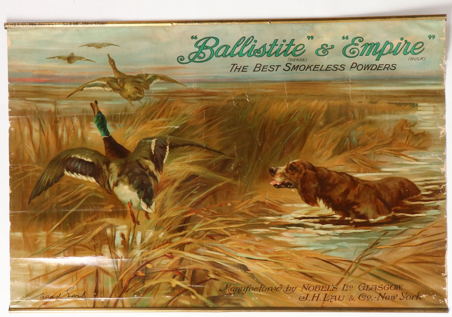 VERY EARLY & RARE Nobel's LTD Glasgow ''BALLISTITE (dense) & EMPIRE (bulk)'' Poster, ''THE BEST SMOKELESS POWDERS'', 27 3/4'' x 18 1/2'', pictures a very early duck hunting image of dog in water near mallards taking flight, colors are great with some edge wear & minor tears, has metal bands top & bottom, this maybe the only one known in America! Grade: Very Good ++ - Value: 200 to 1000