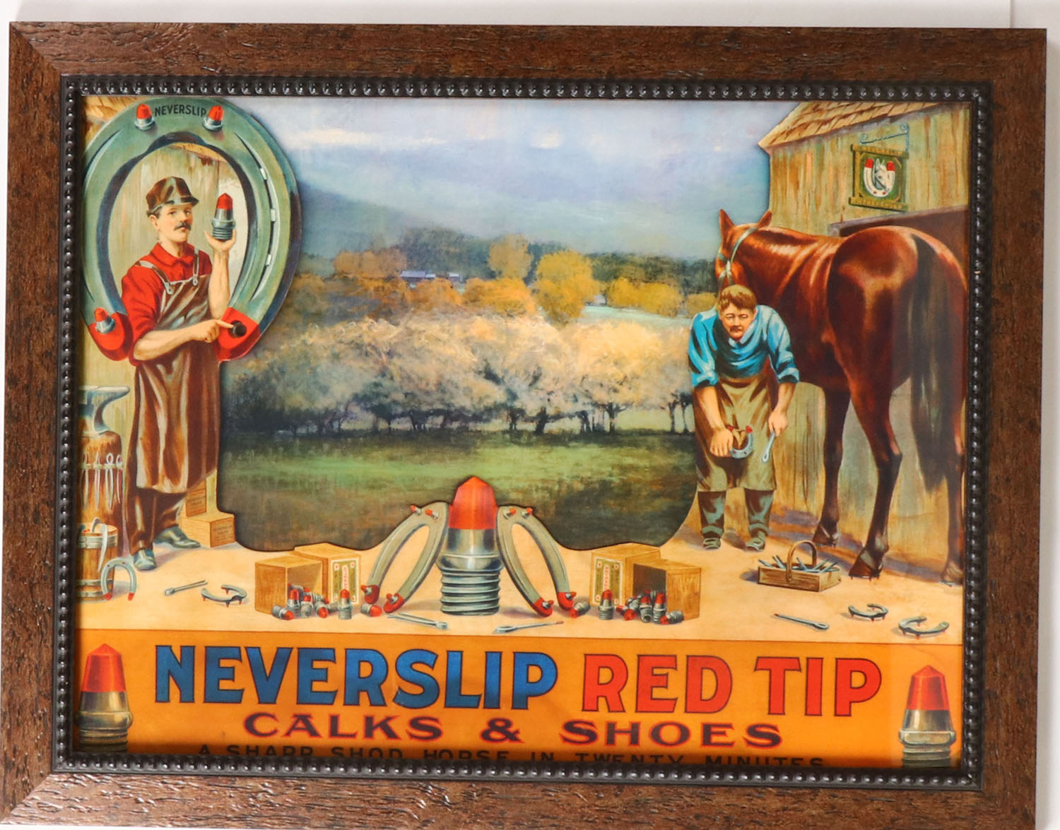 Early ''NEVER SLIP RED TIP CALKS & SHOES'', promotes horse shoeing gear, great colors, 24'' x 18'' image size. Grade: Excellent ++ - Value: 30 to 250