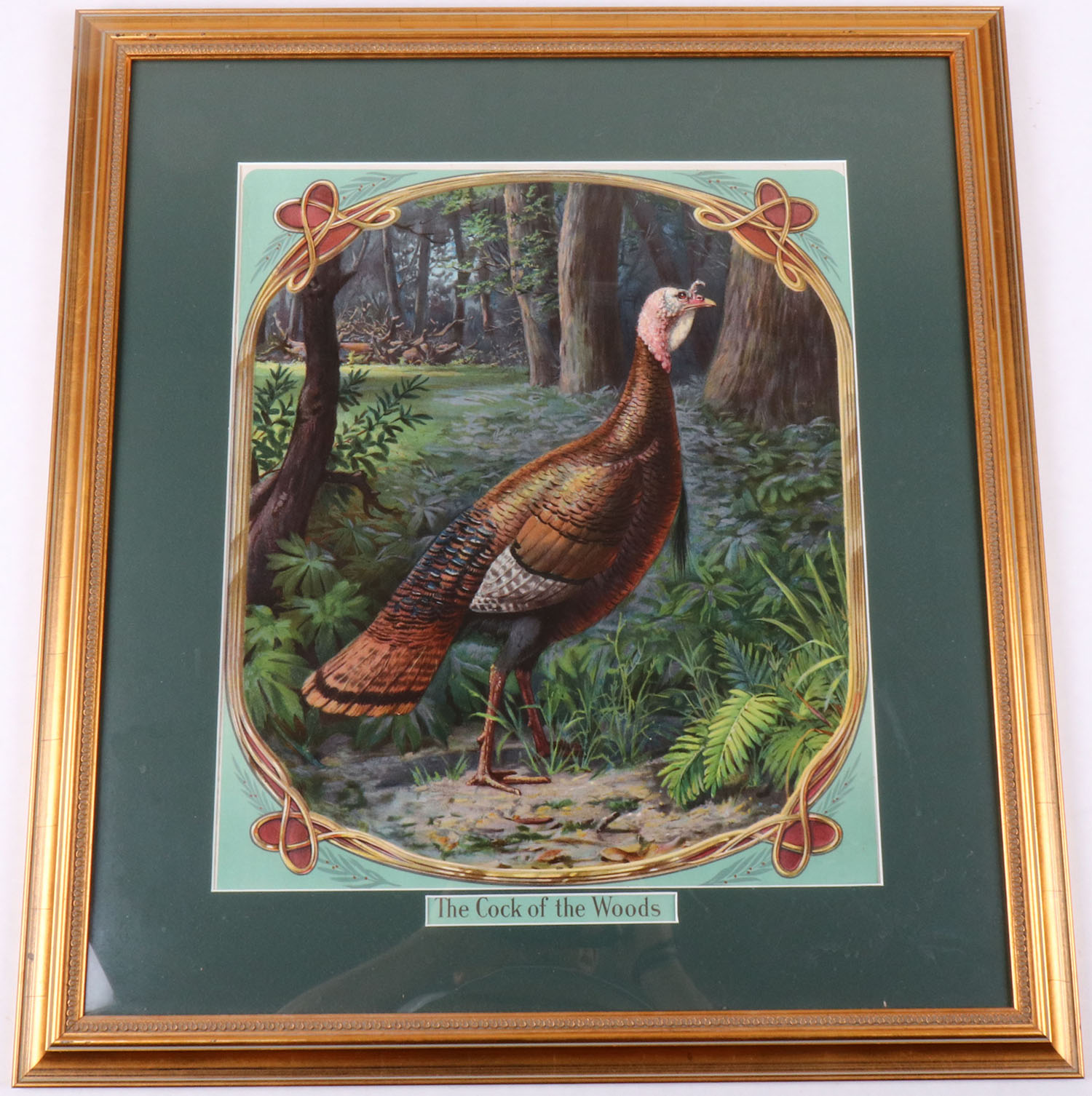 Winchester COCK OF THE WOODS poster, trimmed image of a wild turkey in the woods, has fantastic colors, 15 1/5'' x 18 1/2'' image size, framed. Grade: Excellent - Value: 150 to 500