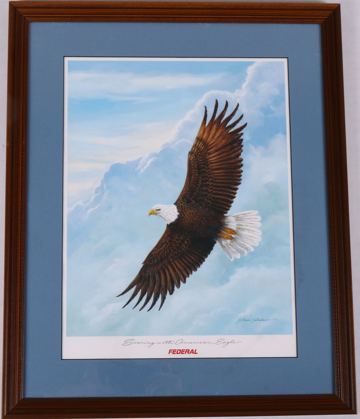 Federal Advertising print pictures American Eagle in flight, framed with original shipping box, 11 1/2'' x 15'' image size. Grade: MINT - Value: 10 to 60