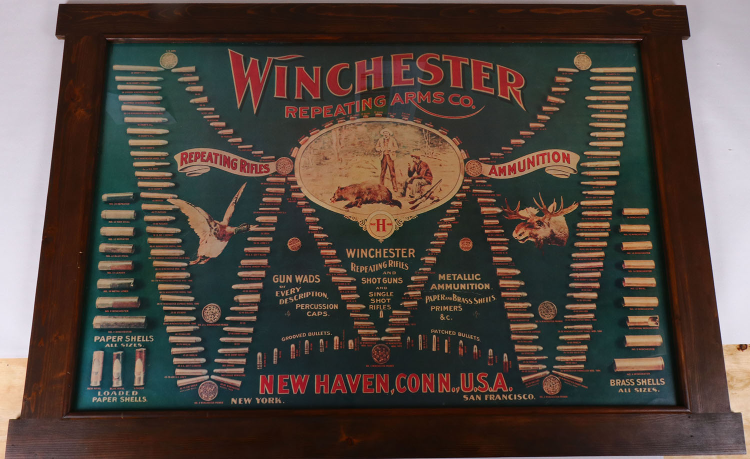 Winchester Litho DOUBLE W Cartridge Board, framed, has great color images of game animals & many cartridges, 59'' x 40'' OA Size. Grade: Excellent - Value: 500 to 2000
