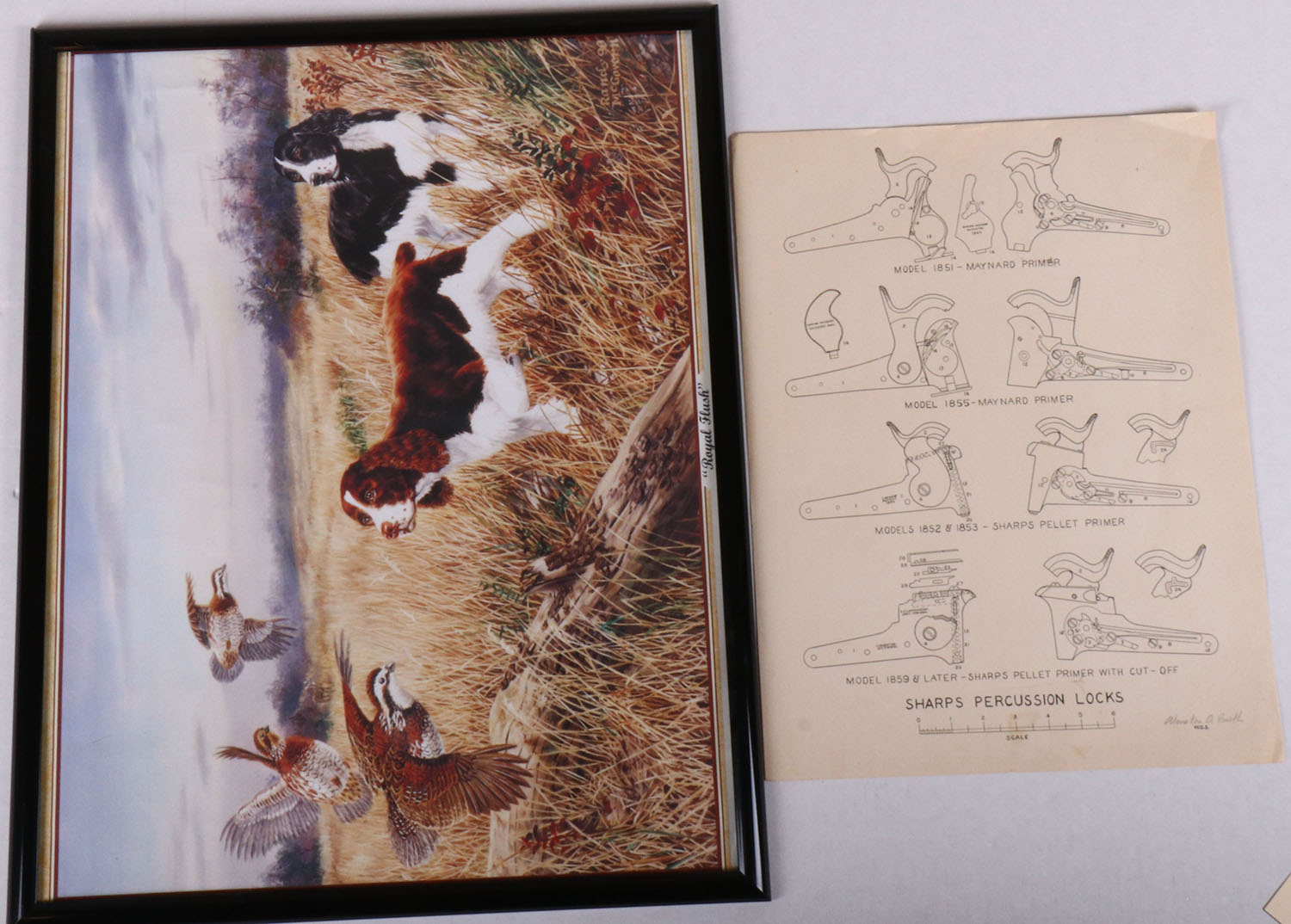 Lot of 2 Prints, Sharps Percussion Locks & a Quail hunting scene. Grade: Excellent - Value: 2 to 50