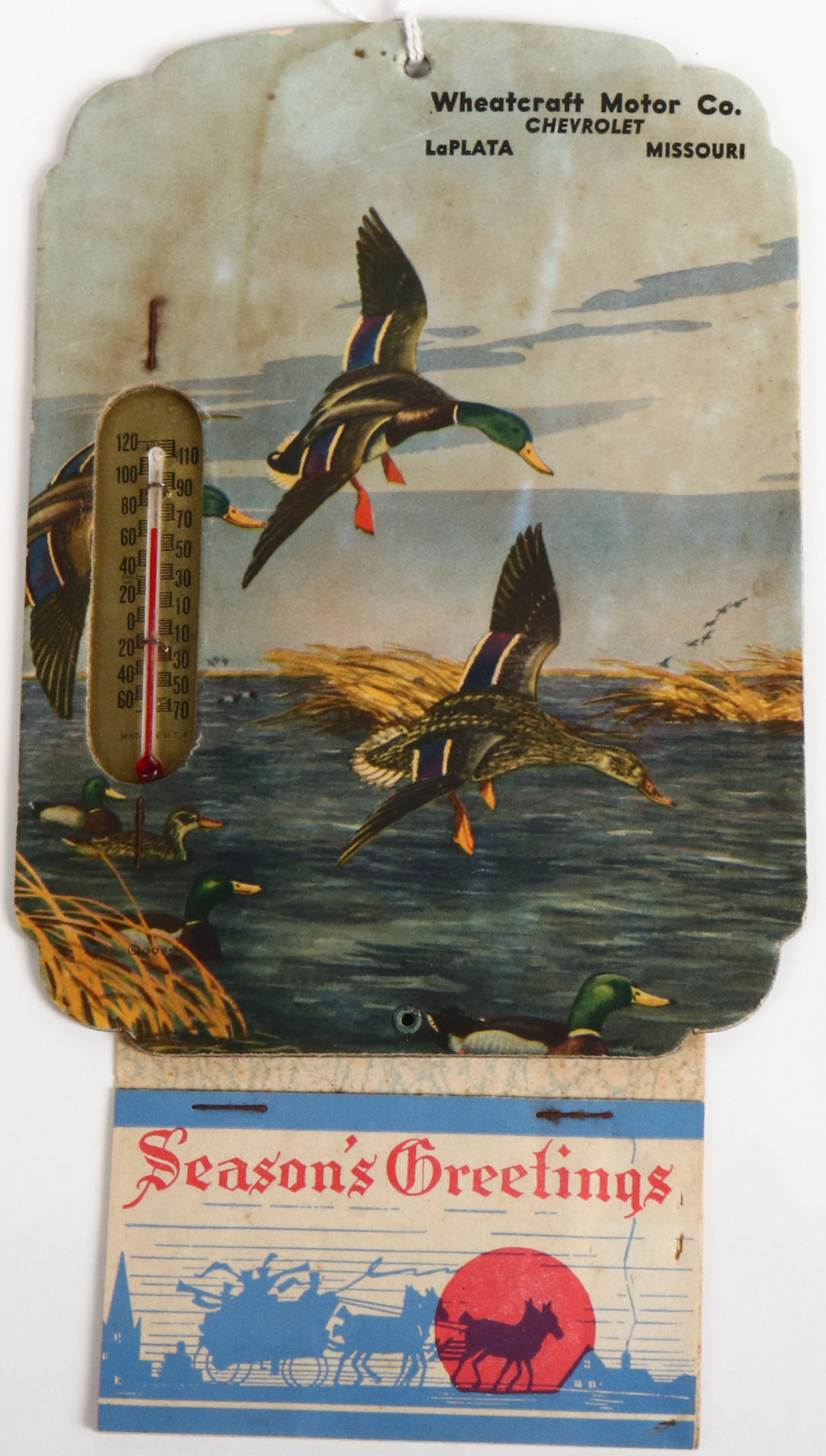 Thermometer with great image of mallards in flight, 5 1/2'' x 7 1/2''. Grade: Excellent - Value: 6 to 30