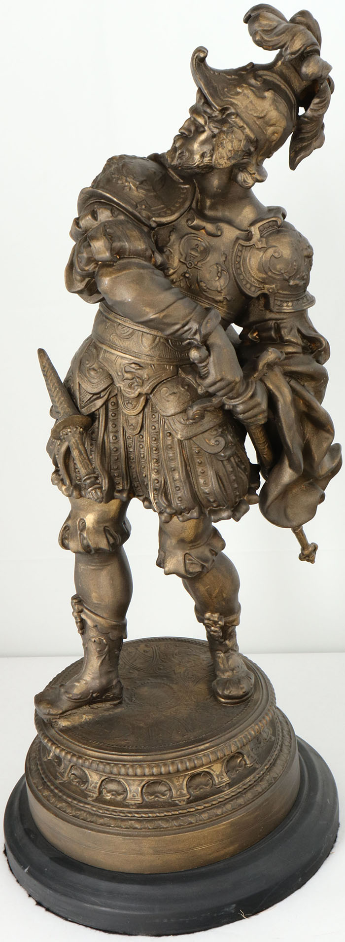 Medieval sculpture of warrior, hollow metal no name, 24'' x 7'' 7''. Grade: Excellent - Value: 10 to 500