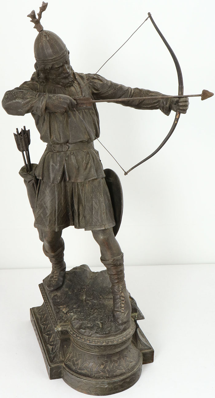 Medieval sculpture of warrior, hollow metal no name, 24'' x 7'' 7''. Grade: Excellent - Value: 10 to 500