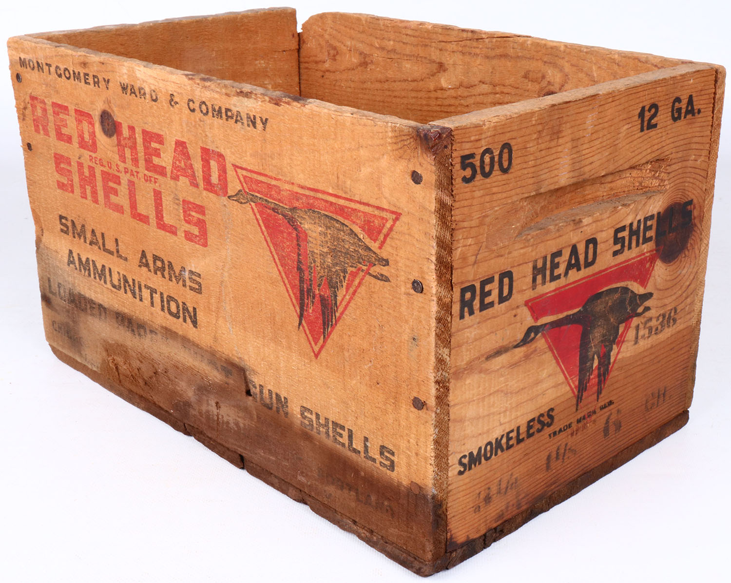 Wards, Red Head with goose flying through triangle logo, 12 ga., No 6 ch., nail construction wood shipping crate, red & black print has minor fading, crate has soiling on lower portion, one corner/side is chipped, overall solid. Grade: Very Good + - Value: 30 to 200