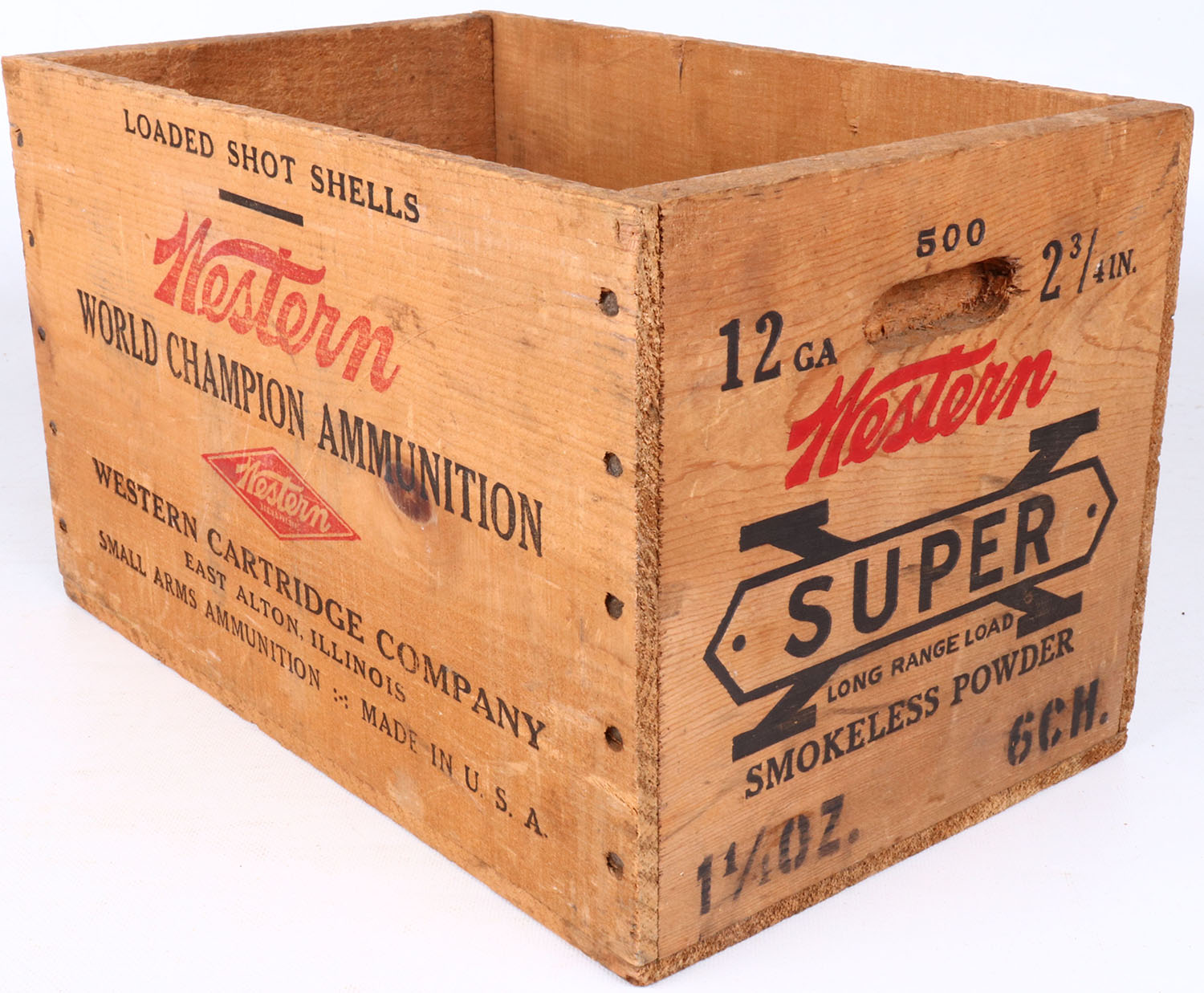 Western Super-X, 12 Ga., nail construction wood shipping crate, black & red print has minor fading, small piece missing from bottom, overall solid. Grade: Excellent - Value: 10 to 40