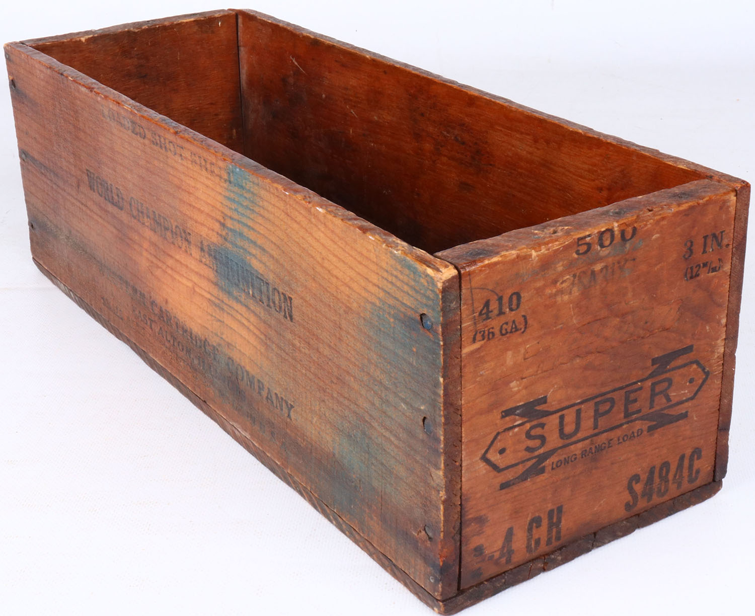 Western Super-X, 410 Ga., nail construction wood shipping crate, black print is solid, red print is faded, age soiling throughout & discoloration on one side, overall solid. Grade: Very Good + - Value: 20 to 100