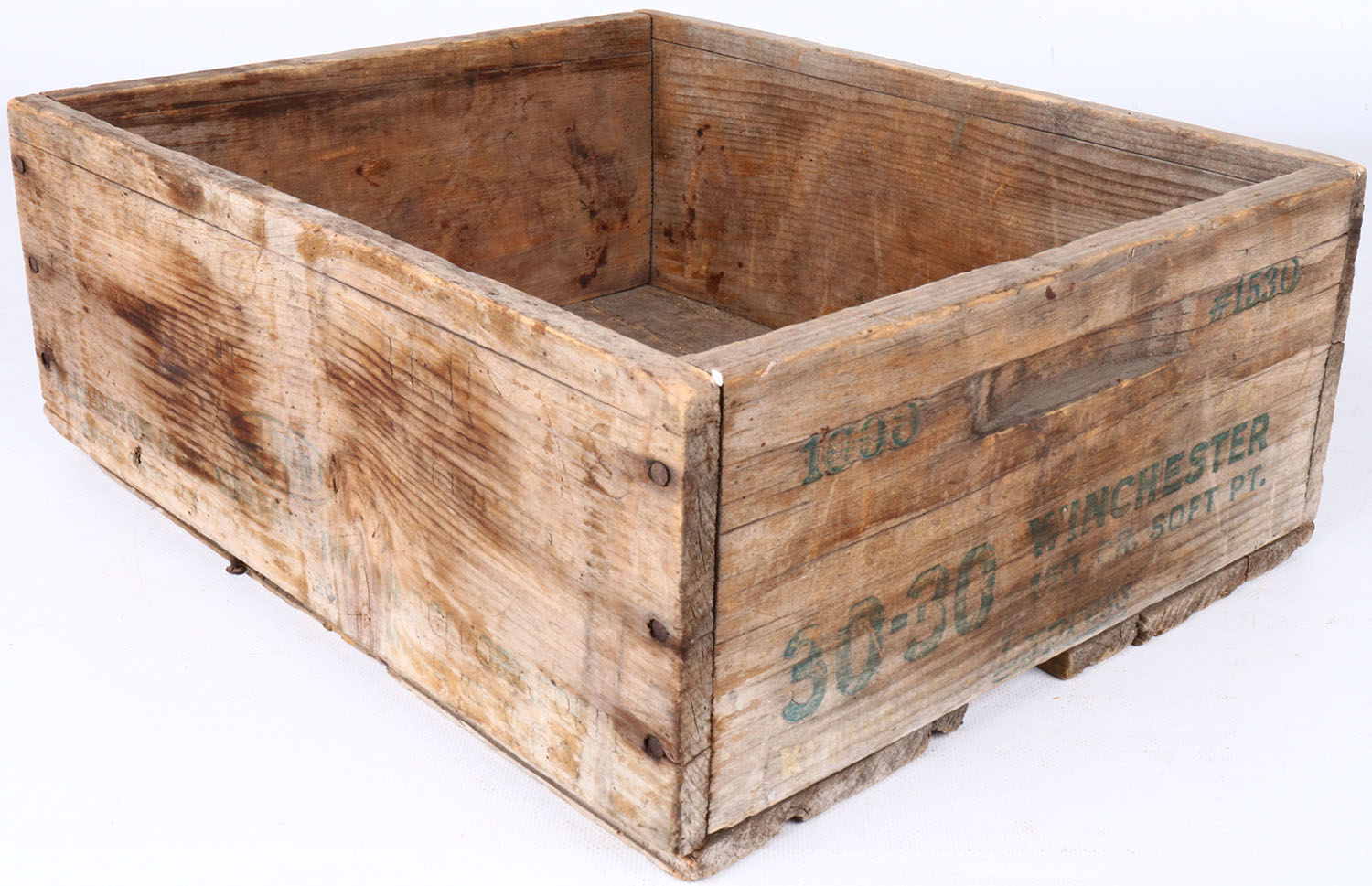 Remington 30-30 Win., nail construction, red & green print is faded, crate has some age soiling, missing piece from bottom of crate. Grade: Good ++ - Value: 2 to 40