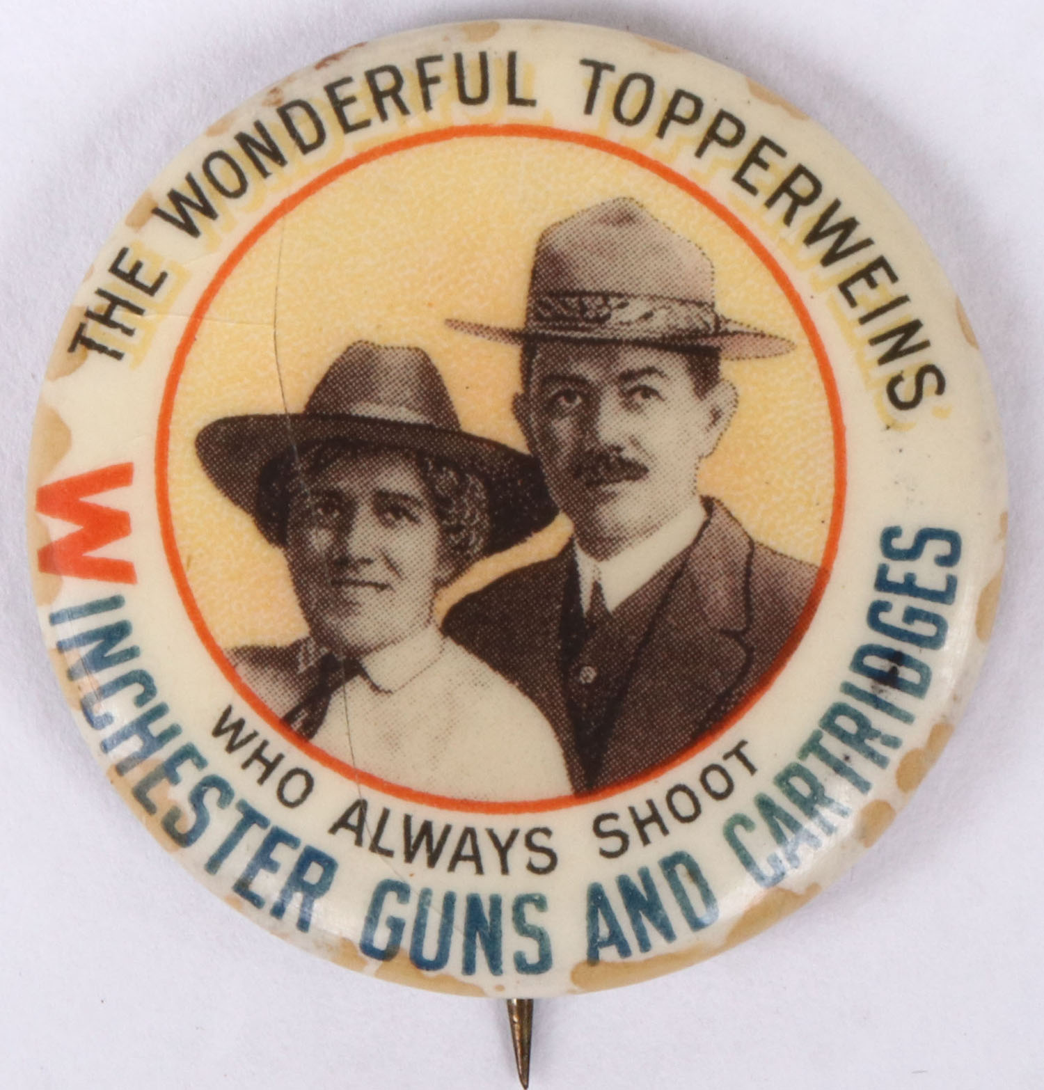 RARE! Winchester Pinback, ''The Wonderful Topperweins Who always shoot Winchester Guns and Cartridges'', with Cowboy hats on, Whitehead & Hoag paperback, pin and paperback are solid with age soiling, hairline crack on pinback. Grade: Very Good + - Value: 40 to 150