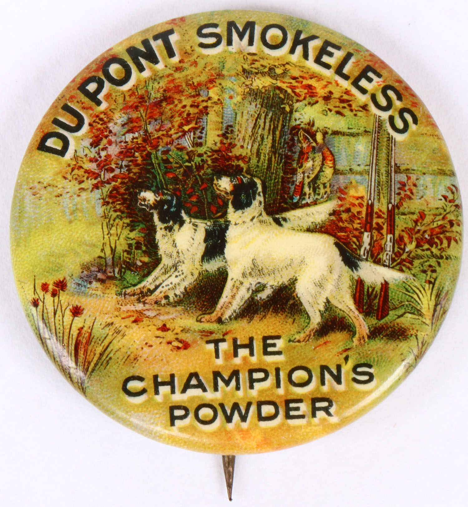 DuPont celluloid pinback, ''The Champion's Powder'', Whitehead & Hoag Co. paperback has minor age soiling, pin has great color. Grade: Excellent + - Value: 20 to 60