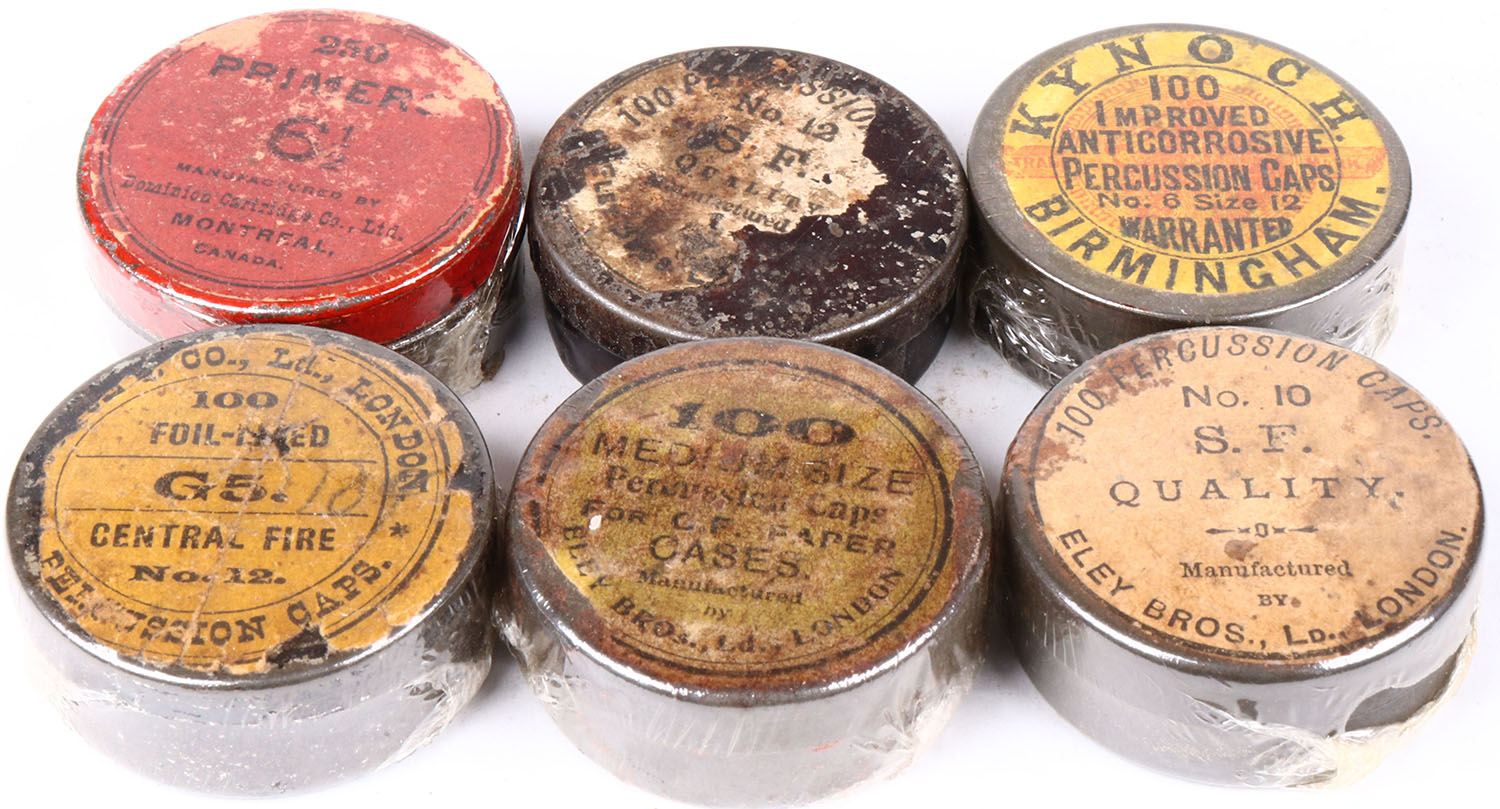 Lot of 5 percussion caps & 1 primer tin, 2 full, 3 partial & 1 empty. Grade: Very Good - Value: 10 to 60