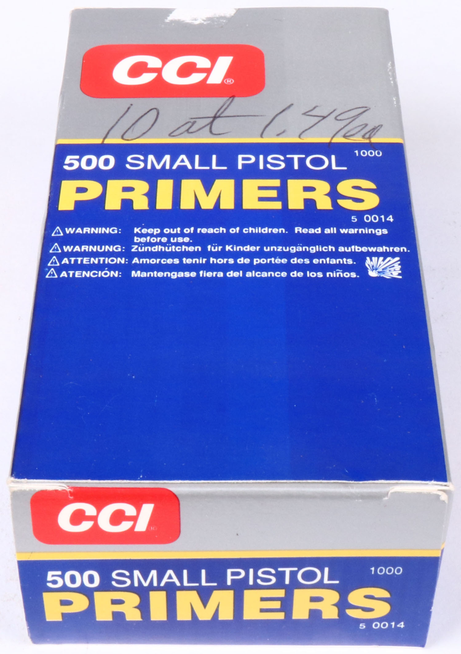 CCI primer brick, FULL, Small pistol primers, 1000 in the brick, all bright and clean. Grade: Excellent ++ - Value: 40 to 150