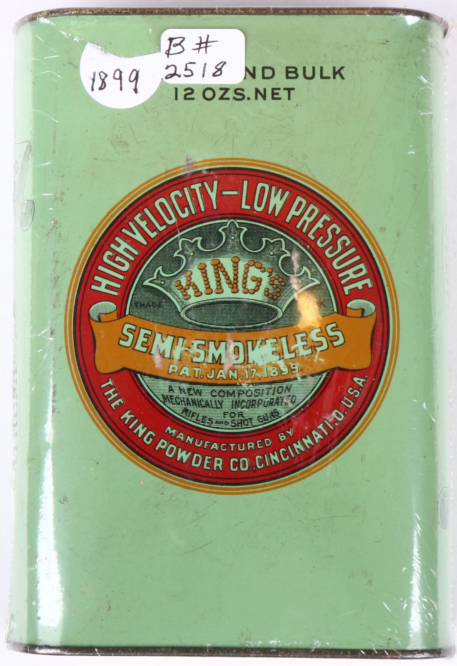 The King Powder Gunpowder tin, empty, has age soiling. Grade: Very Good ++ - Value: 30 to 90