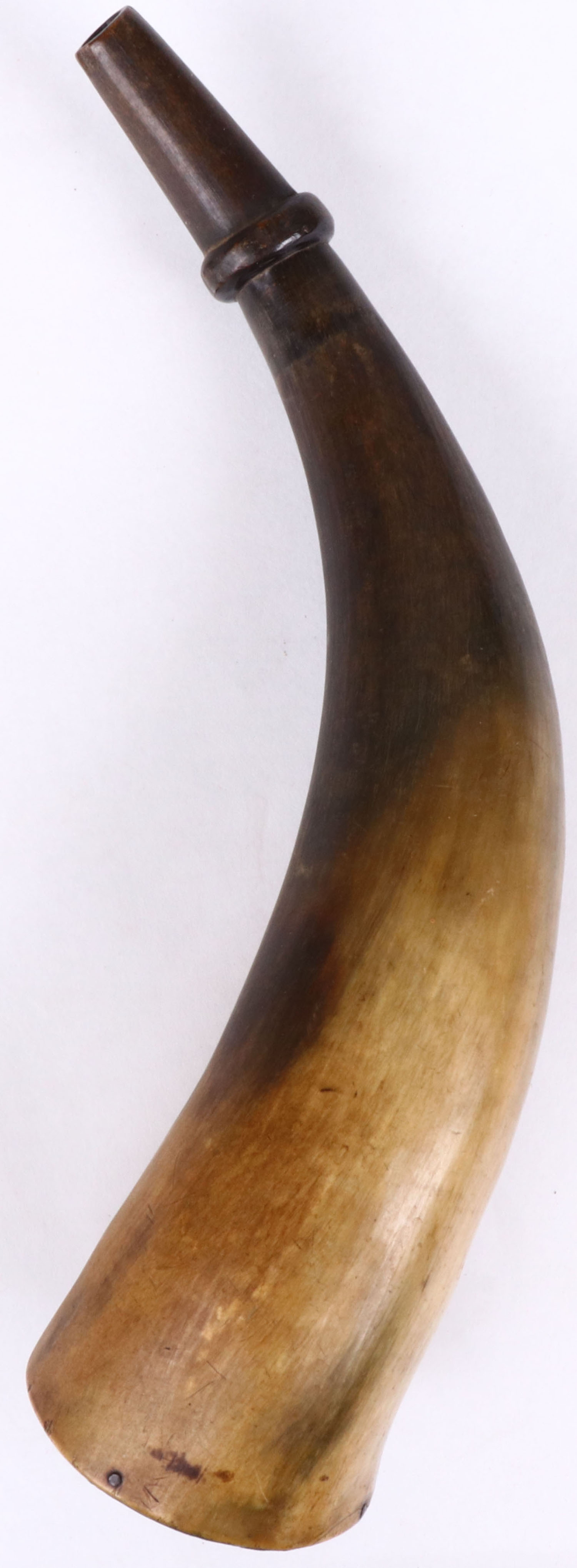 Powder horn, solid with some age soiling. Grade: Excellent - Value: 20 to 200