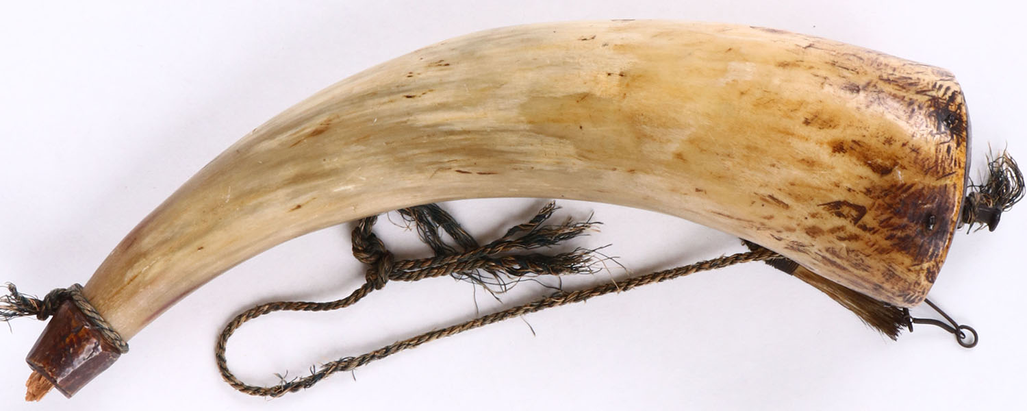 Powder horn, solid with some age soiling. Grade: Excellent - Value: 20 to 200